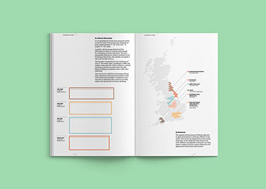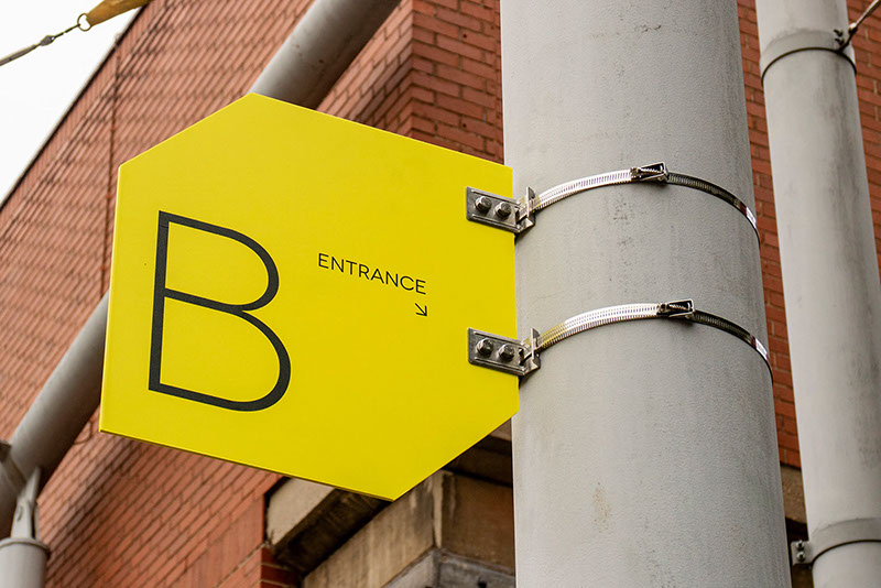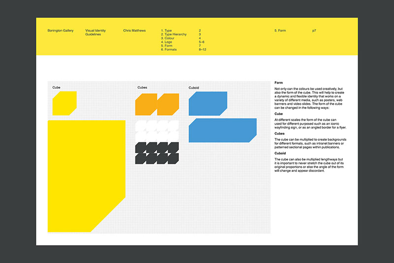 This gallery is a contemporary arts venue positioned within a complex university building. This makes it hard to identify and locate, despite its significant history. The existing visual identity was appropriate but required modification to make the gallery more noticeable and appealing. As such the typeface and logo were retained but the faint grey colours and outlines were re-prioritised in favour of strong block colours and a refined box icon. A near luminous yellow was favoured as the primary hue within the new colour system because this contrasted with the university's bright pink visuals and the strong red brick of the Bonington building.