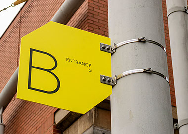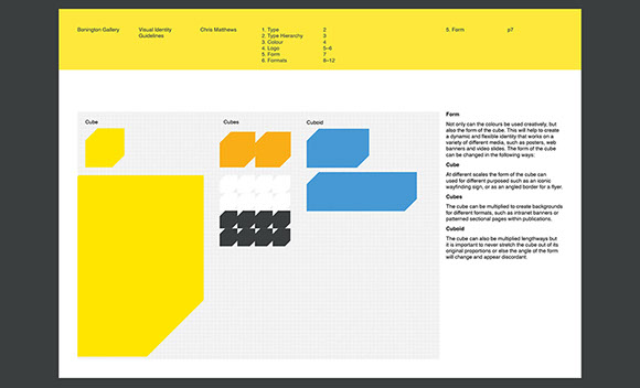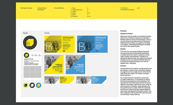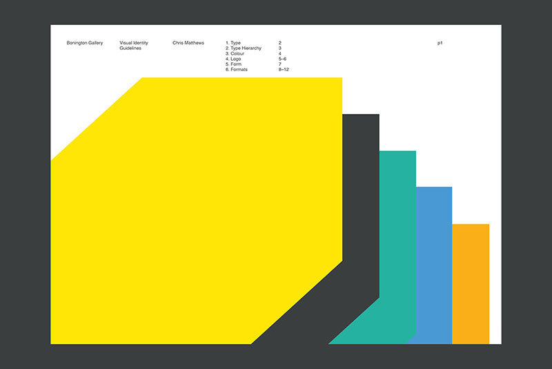 This gallery is a contemporary arts venue positioned within a complex university building. This makes it hard to identify and locate, despite its significant history. The existing visual identity was appropriate but required modification to make the gallery more noticeable and appealing. As such the typeface and logo were retained but the faint grey colours and outlines were re-prioritised in favour of strong block colours and a refined box icon. A near luminous yellow was favoured as the primary hue within the new colour system because this contrasted with the university's bright pink visuals and the strong red brick of the Bonington building.